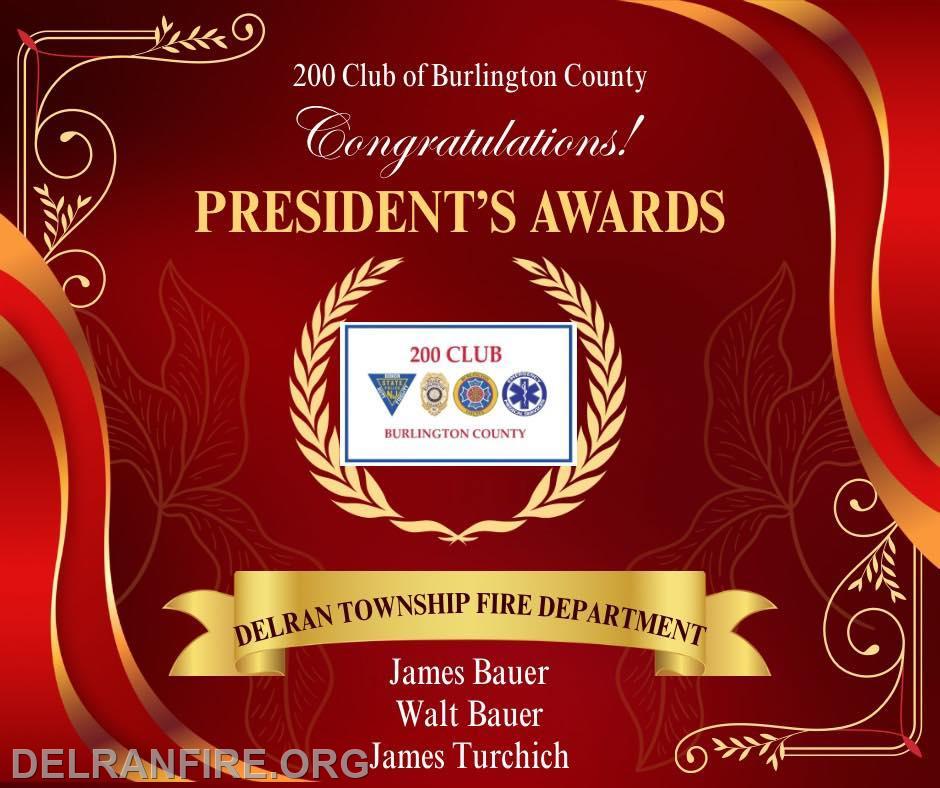 At the 200 Club of Burlington County Annual Honor-Valor Awards Dinner on March 20th, the President’s Awards were bestowed upon James Bauer, Walt Bauer, and James Turcich of the Delran Fire Department.